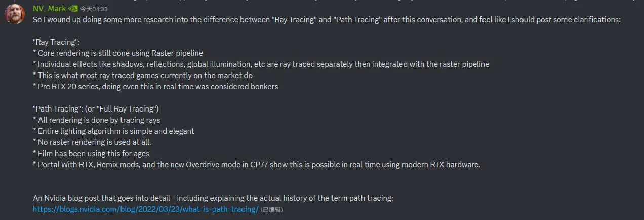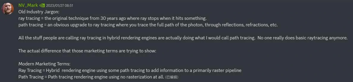 对于全景光线追踪 ,也就是 英伟达 所宣传的 路径追踪 和 光线追踪 实为一种营销概念。在这里援引 英伟达 RTX Remix 开发团队 的顶级工程师之一 Mark 的 Discord 聊天记录: